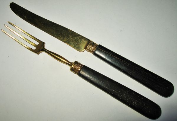 Fruktbestick/Dessertbestick Fruktknivar/Dessertknivar, 12 st samt Fruktgafflar/Dessertgafflar 12 st. Mässing med träskaft. Tidigt 1800-tal