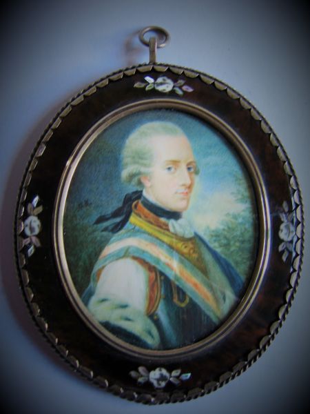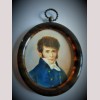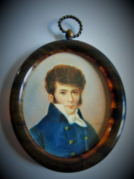 Miniatyrporträtt. Mansporträtt i medaljongformad ram av sköldpadd. 1800-tal. Troligen signerad Kohlman. 6x5 cm