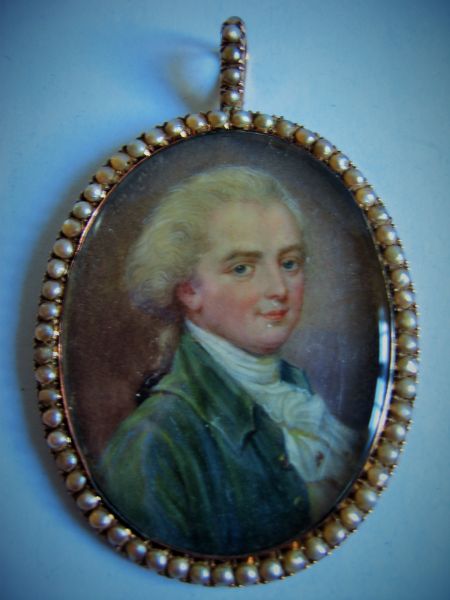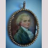 Miniatyrporträtt i oval ram med dekor av pärlor. Mansporträtt. Svårläslig signatur i övre vänster hörn