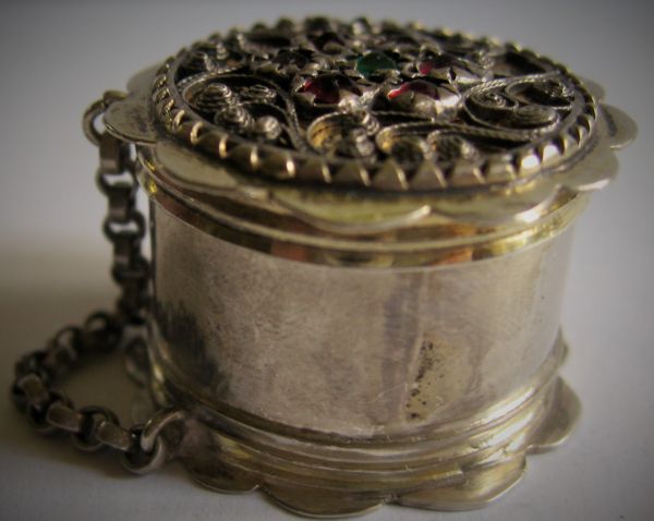 Dosa med lock, silver. Rund. Johan Fredrik Ryberg. Uddevalla. Mästare 1759-1761/64. Ovanlig mästare. Känd endast med ett fåtal arbeten. Invändig förgyllning. D. 5 cm. H. 3 cm. Dekor av bibliskt motiv på locket
