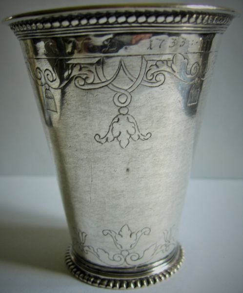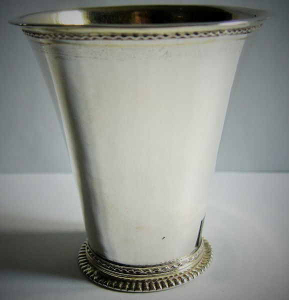 Bägare, silver. Delvis förgylld samt försedd med invändig förgyllning. Försedd med åldermansranka. Petter Söderbom, Örebro. Mästare 1761-1777. C-1761. 9,2 cm. D. 7,8 cm